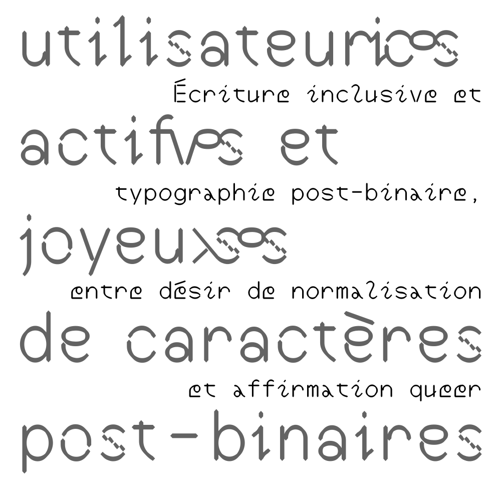 En conclusion de sa Leçon, Roland Barthes affirmait vouloir « tricher la langue » afin de déjouer sa dimension « fasciste », qui nous oblige à dire au sein de son cadre normatif. Les inventions langagières de l’écriture inclusive tout comme les audaces formelles des typographies post binaires ont comme objectif de questionner cette norme et d’exercer notre capacité à la transgresser, à y trouver des biais et des fêlures, des échappatoires et des terrains de lutte.