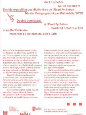 Admissions Formations Diplômes & travaux Agenda Ateliers et cours publics International VAE À la une Journal Agenda AGENDA Création artistique et IA, Franck Bauchard Conférence 6 novembre 2025 à Pau AGENDA Chantier Copyleft, création céramique éphémère Workshop 5 – 8 novembre 2025 à Toulouse AGENDA Conférence de Lou Cellard Conférence 17 novembre 2025 à Pau JOURNAL Voyage d’étude à Paris 2025 Voyages Hors les murs AGENDA Pour une poétique d’infra-ordinaire, Samira Ahmadi Ghotbi Workshop 3 – 7 novembre 2025 à Tarbes AGENDA Exposition des diplômé·es de Pau Exposition 15 octobre 2025 à Billère Travaux Tous les travaux Atelier Super Bi 2/2, 2023 Expositions Bibliothèques 2032 Lia PorquetLia Porquet (DNSEP DGM 2022) Nous n'avons pas pu confirmer votre inscription. Merci, votre inscription est confirmée. Inscrivez-vous à notre newsletter pour suivre nos actualités. Envoyer En vous abonnant, vous acceptez de recevoir notre infolettre au sujet de l’actualité de l’ÉSAD Pyrénées. Vous pouvez vous désabonner en tout temps. Pour plus d’informations, consultez notre politique de confidentialité ou contactez-nous. ✗